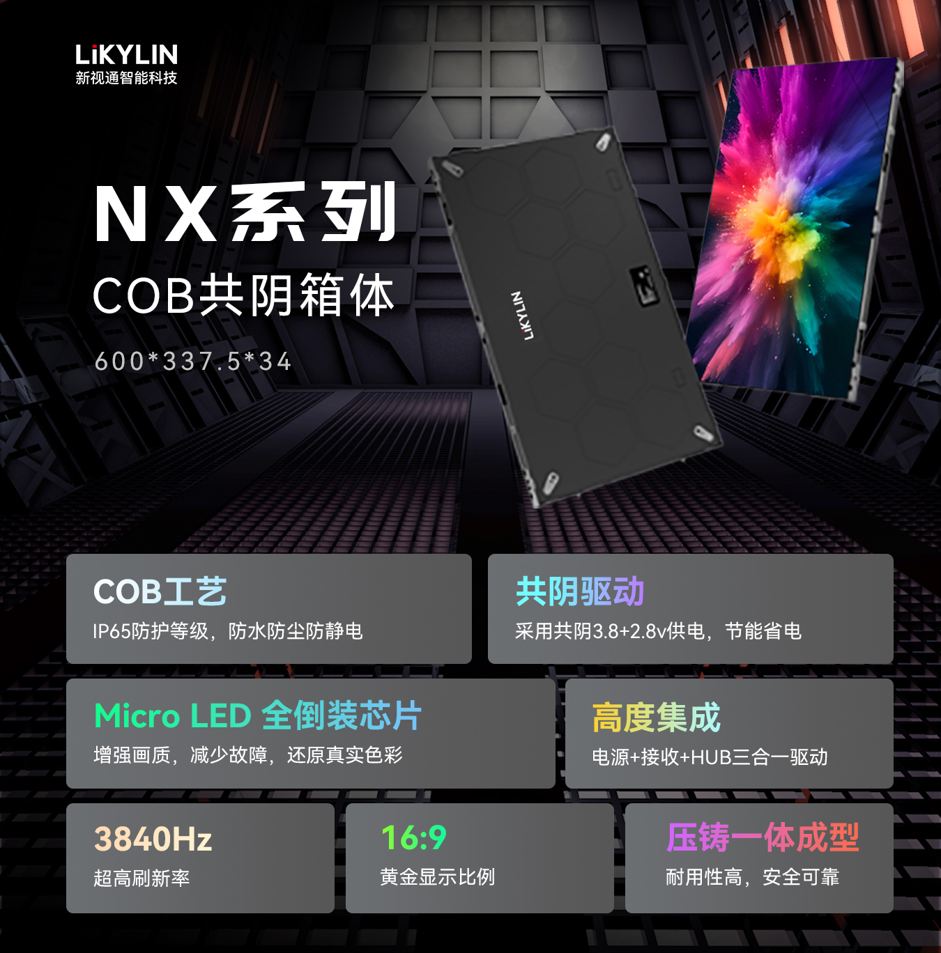 今年会作为 COB 源头厂家,在重庆、江西两地建设了数字化工厂。引进了业内顶尖的 COB 封装设备、SMT 贴片设备以及贴片机器人等一系列高端设备,精心打造了涵盖 SMD 小间距、COB 小间距以及 Mini/Micro LED 显示的全自动化生产线。这些先进的设备和技术,确保了 NX 系列 COB 显示屏从生产到出厂的每一个环节都达到最高标准。